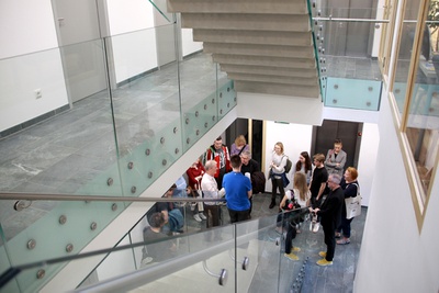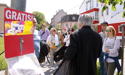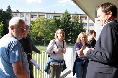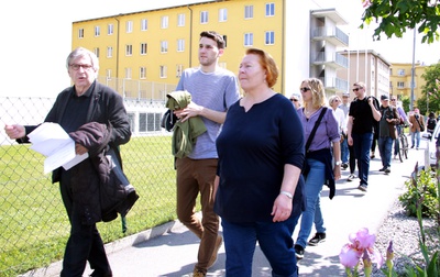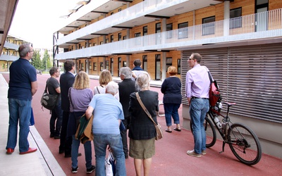 Der St. Pöltener Architekt Helmut Stefan Haiden übernahm dankenswerter Weise die Moderation dieses Rundgangs, nachdem Reinhard Seiß krankheitsbedingt verhindert war. Zehn Stationen wurden auf dem 6 km langen Rundweg besucht, bei denen zehn geladene ExpertInnen Rede und Antwort standen zu klimarelevanten Fragen, die an diesen Gebäuden exemplarisch aufgezeigt wurden. Dazwischen bot sich en Passant immer wieder Gelegenheit, anhand weiterer Bauten darüber hinaus reichende Problematiken abzuhandeln. In diesem anschaulichen Tableau wurden folgende Themen hervorgehoben: Städtebau und Nutzungsmischung, Umgang mit historischen Gebäuden, Belebung strukturschwacher Stadtviertel, Energieeffizienz neuer Bauten, wegweisende Ansätze im verdichteten Wohnbau vor 40 Jahren und heutige Lösungen, klimagerechtes Bauen in Kombination mit einem Sozialprojekt.