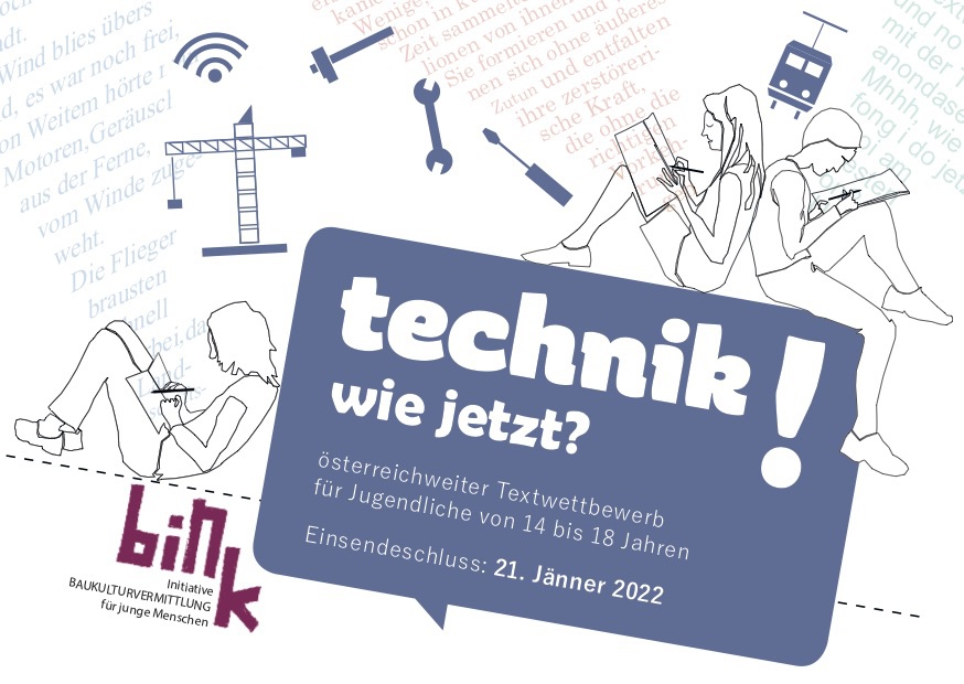 Der Wettbewerb technik! wie jetzt? regt Jugendliche zum bewussten Schauen an und lädt junge Menschen ab 14 Jahren ein, mit den Medien Sprache und Text ihren Zugang zu Technik in unserem Lebensalltag aufzuzeigen. Aus einem Katalog mit Fachbegriffen aus Technik und Baukultur sollen mindestens drei Fachbegriffe herausgegriffen und in den Text intergriert werden (siehe unten.)