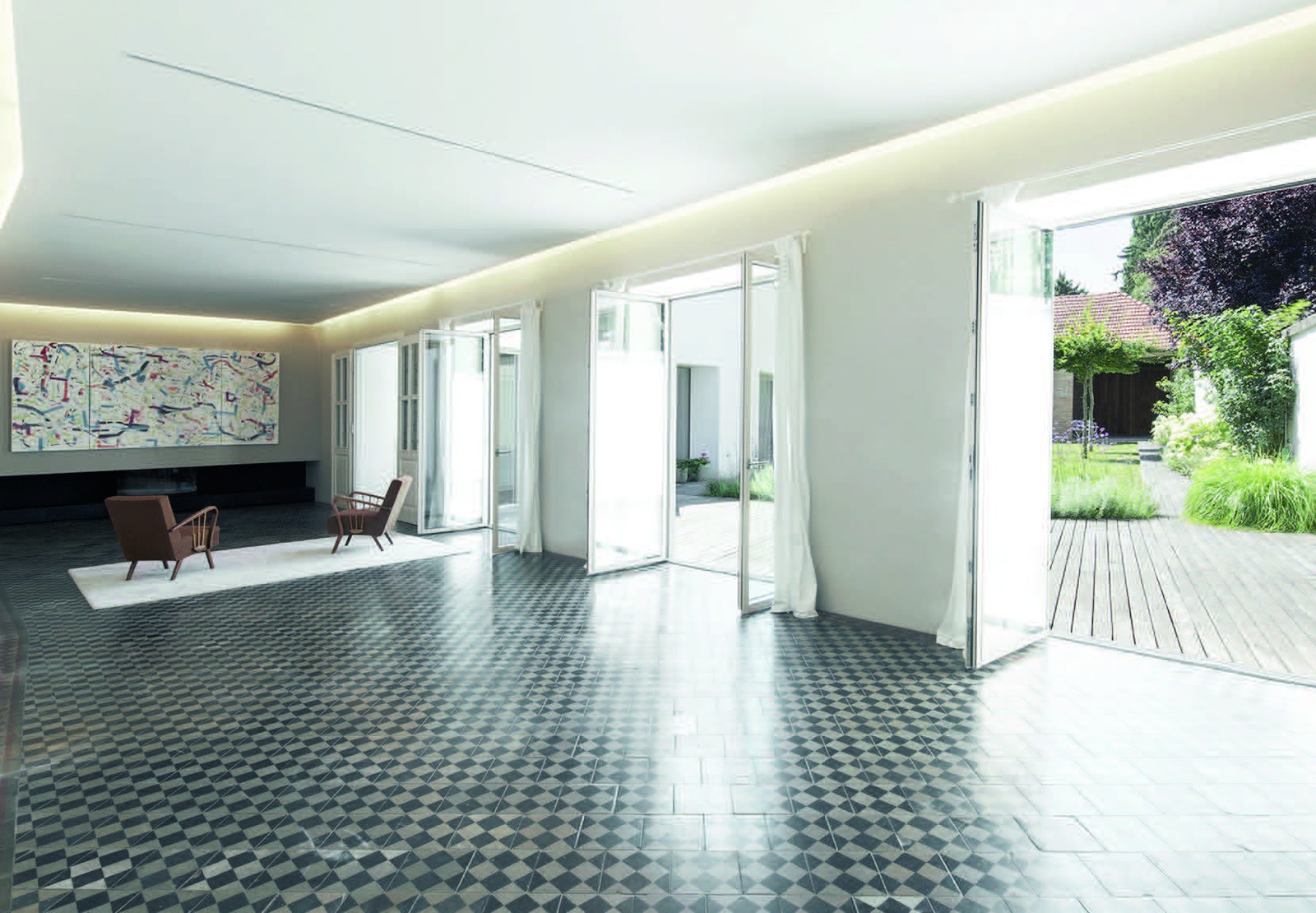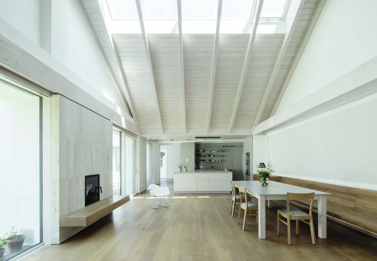 Der nordseitige Straßentrakt erfüllt die öffentliche Aufgaben des Empfangs und stellt Räume für Gäste bereit. Über die zentrale Halle des Althauses zum geschützten Hof hin erreicht man das eigentliche familiäre Wohngebäude und die Scheune, die als hoher, offener Raum mit den beiden anderen Trakten den ruhigen Innenhof einfasst.