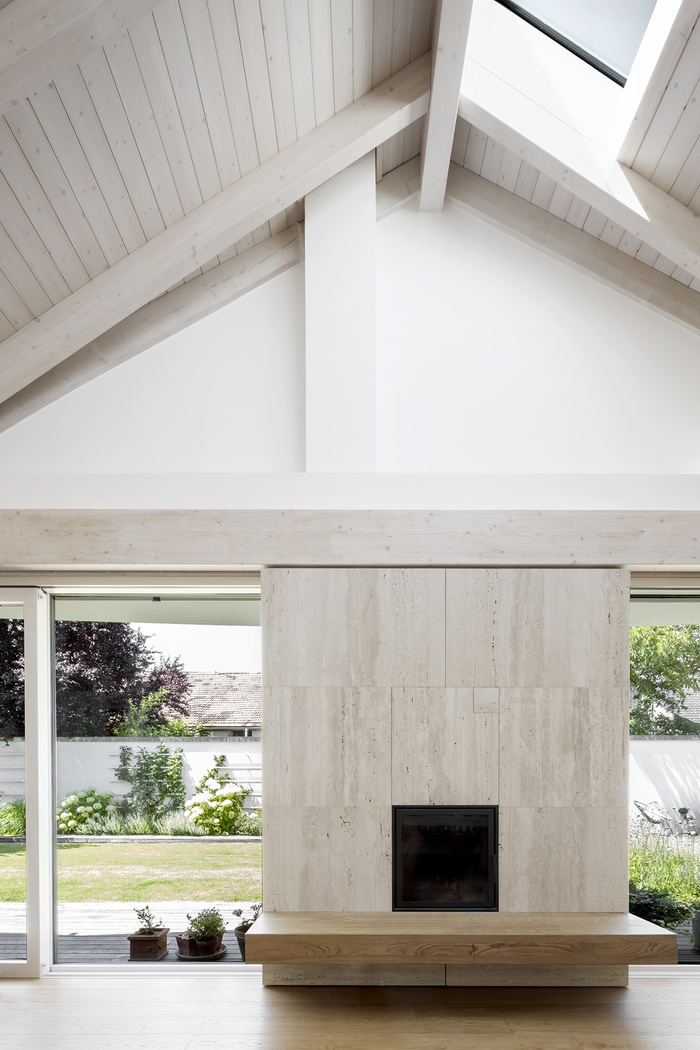 Der Neubau zeigt sich wie eine Wand aneinander gereihter Häuser archetypischer Form. Sein Baukörper verbindet qualitätsvolle Innenräume mit hohen Raumvolumen und einer ästhetischen Schlichtheit. Das Material entspricht dem Einsatz und Maßstab örtlich vorgefundener Bauweisen. Die tragenden Wände bestehen aus zweischaligem, teils mit Schuttmaterial gefülltem Mauerwerk aus 25 cm Hochlochziegeln, deren massiver Eindruck durch Faltung ihrer äußeren Wandschicht verstärkt wird und sich gartenseitig großzügig öffnet. Darüber ruht der helle hölzerne Dachstuhl mit Satteldächern.