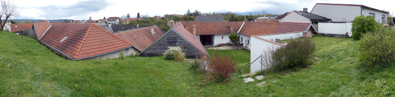 Es ist quasi ein doppelter Streckhof mit zwei L-förmigen Trakten, der Einfahrt in der Mitte und einem Hof mit ca. 300 m² dazwischen. - Er steht mit dem Rücken zum 1-Geschoss hohen Hang, mit Kellern darunter.