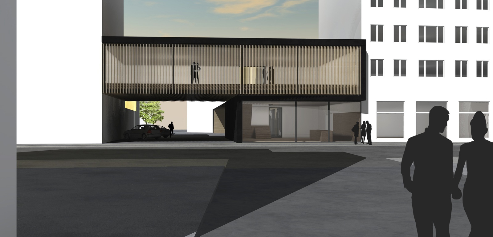 Hervorragend gelang dem Architektenteam von ah3 die straßenseitige Überbauung des bestehenden, eingeschoßigen Verkaufsraums und der Einfahrt. So konnte die derzeitige Lücke in der Straßenflucht durch das neue Gebäude geschlossen werden. Die beiden sehr unterschiedlichen Gebäudefunktionen sind über die Konstruktion und die formale Ausgestaltung zu einer architektonischen Einheit zusammengefasst.