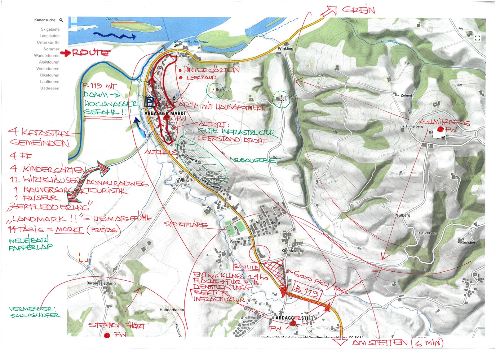 Eingebettet zwischen Donau und Mostviertler Hügelland liegen die Katastralgemeinden Ardagger Markt, Ardagger Stift, Kollmitzberg und Stephanshart, die in der Marktgemeinde Ardagger administrativ vereint sind und trotzdem ihre Vielfalt wie Eigenständigkeit bewahrt haben. Von den vier Gemeinden fällt Ardagger Markt besonders ins Auge, liegt sie doch eingeschnürt zwischen dem Hochwasserschutzdamm mit der B119 und dem Hang. Sie zeichnet sich durch eine intakte Infrastruktur im „Altort“ und den neuen Ortsteil - der Sonnensiedlung - in attraktiver Hanglage aus. BewohnerInnen von Ardagger sowie Interessierte aus den Nachbargemeinden sind eingeladen, den Ort im gemeinsamen Gehen, Betrachten und miteinander Sprechen zu erkunden. Abschließend werden im Gasthaus Stöger und PapperlaPub die Wahrnehmungen gemeinsam reflektiert. - Im Idealfall entstehen neue Ideen, die dazu führen können, die Gemeinde noch lebendiger und lebenswerter zu gestalten.