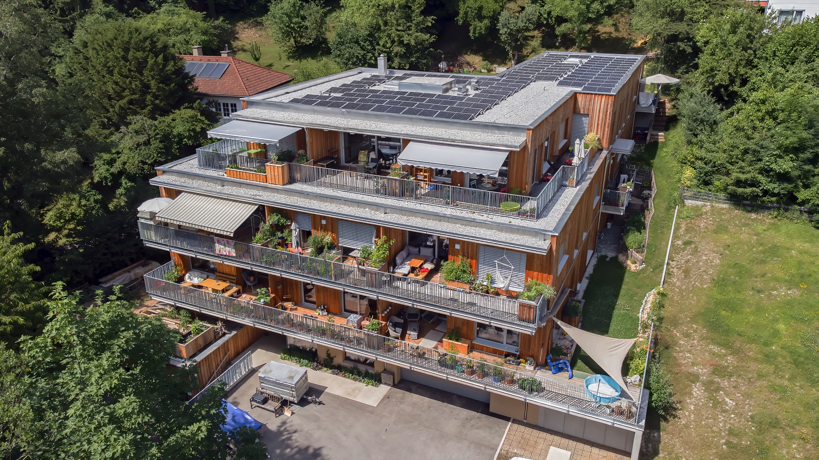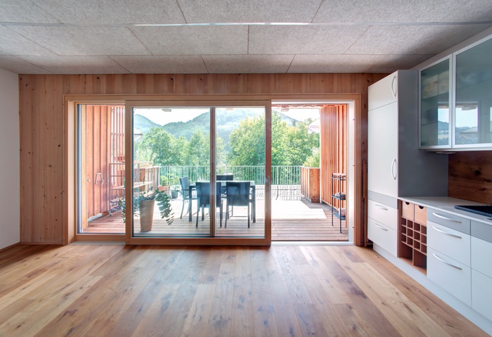 Am Rand von Waidhofen an der Ybbs fand sich ein Grundstück mit 2.622 m² auf einem sehr steilen Hang, zwei Architekt:innen bat man um Entwürfe, das ortsansässige Büro w30 machte das Rennen. „Ich wollte immer schon ein gemeinschaftliches Wohnprojekt planen“, sagt Projektleiter Martin Pichler. Das Anforderungsprofil war klar: Ein Holzbau mit hohem Eigenleistungsanteil, zwölf Wohnungen voller Licht und Luft, außerdem eine Vielfalt an Gemeinschaftsflächen.