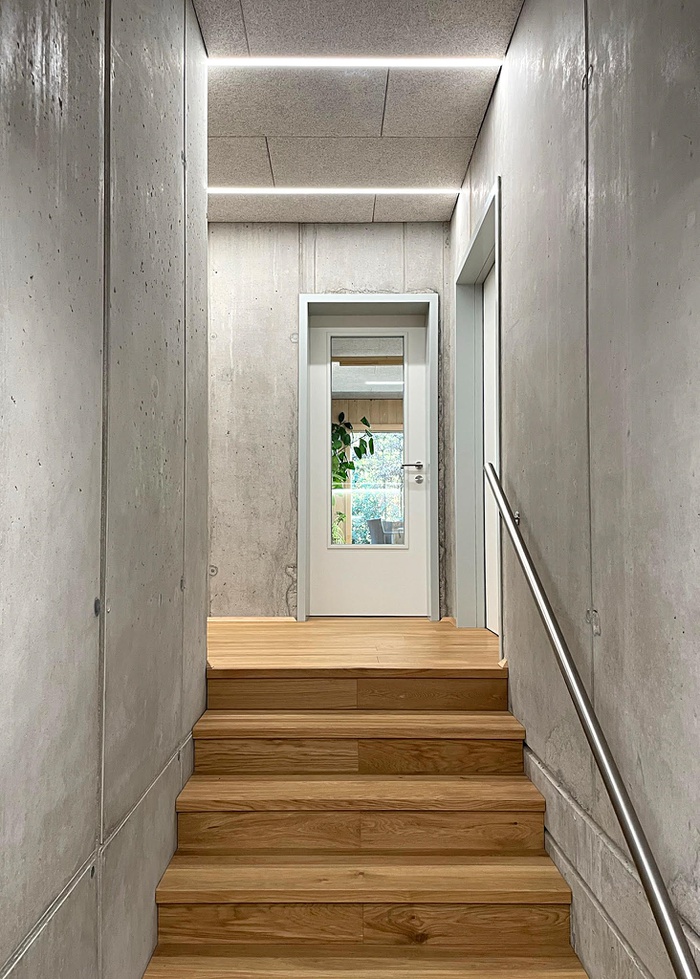 Das Terrassenhaus im Hang ist ein Hybridbau. Alle erdberührenden Bauteile und Decken sind aus recyceltem Beton, das Kellerfundament mit der Tiefgarage, in der de facto nur Fahrräder stehen, ist in den Hang geschoben.