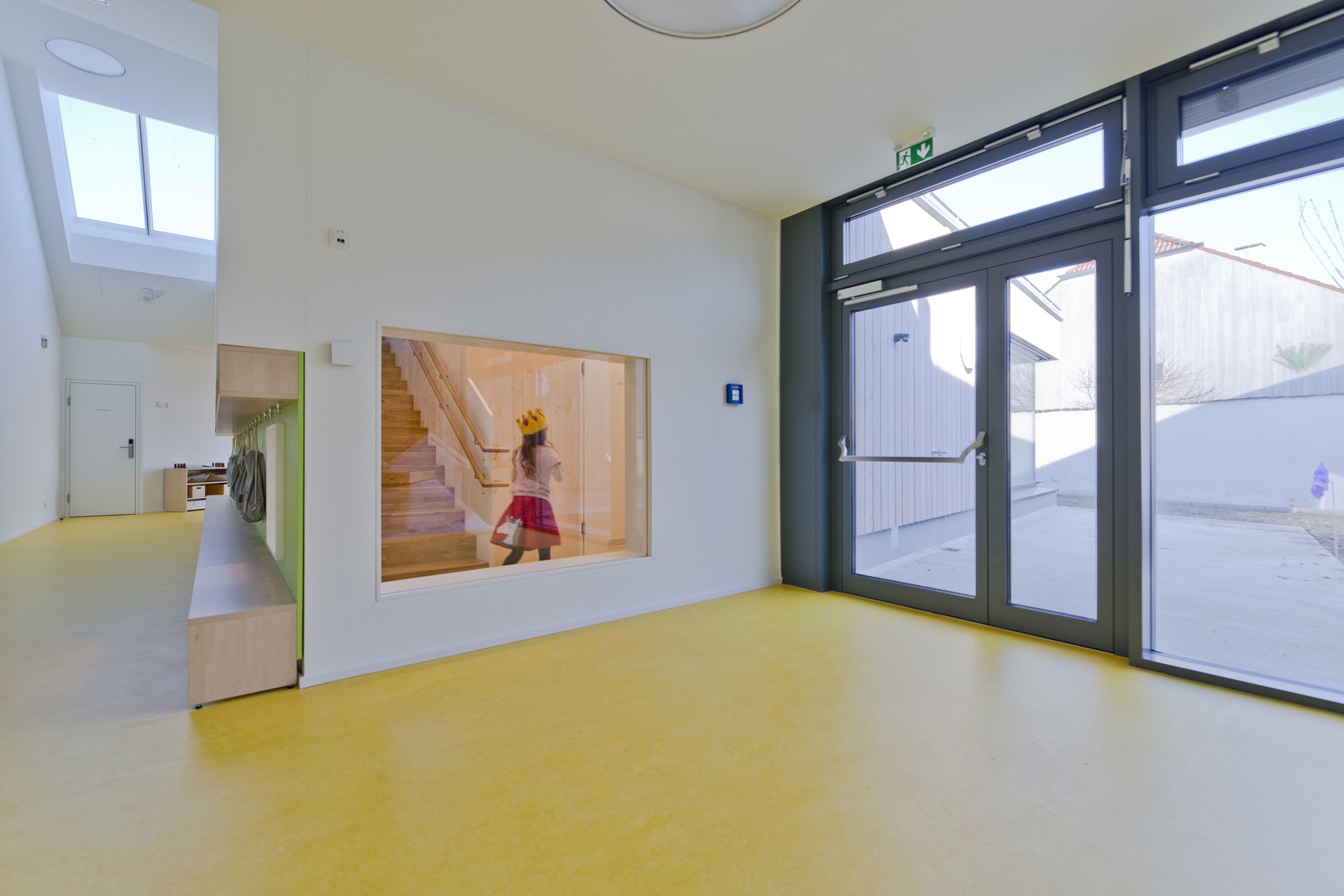 Ein wesentlicher Aktivator für die geistige und seelische Entwicklung der Kinder ist natürliche Belichtung und vor allem Besonnung. Deshalb wurden die Haupträume mit großzügigen Fensterflächen ausgestattet, sodass im Winterhalbjahr die wenigen Sonnenstunden ihre volle Wirkung entfalten können. Im Sommer sind die Gruppenräume durch den außenliegenden Sonnenschutz schattig und kühl.