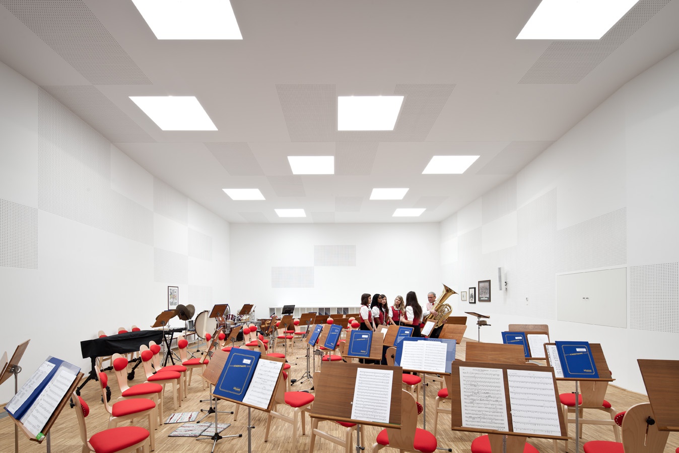 vorbehalten. Die gleichmäßige natürliche Belichtung erfolgt von oben über Lichtkuppeln. Die raumakustischen Maßnahmen sollten den Raum nicht dominieren und wurden in einem Spiel aus gelochten und glatten weißen Wandverkleidungen